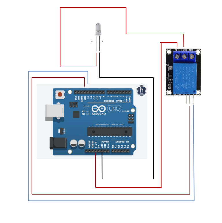 - Connect the Arduino 3.3v to relay pin NC (Normally closed)