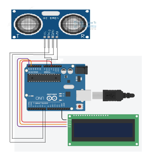 - Connect SDA and SCL pin in the LCD to A4 and A5 Arduino pins