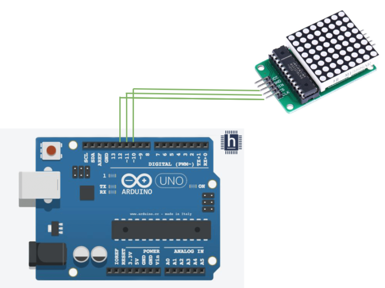 - Connect the Din pin on the Dot matrix to Arduino pin D10