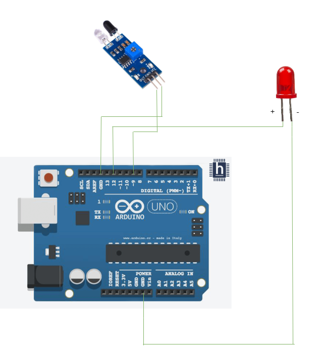 - Connect Out pin in the IR sensor module to the pin D9 on the Arduino.